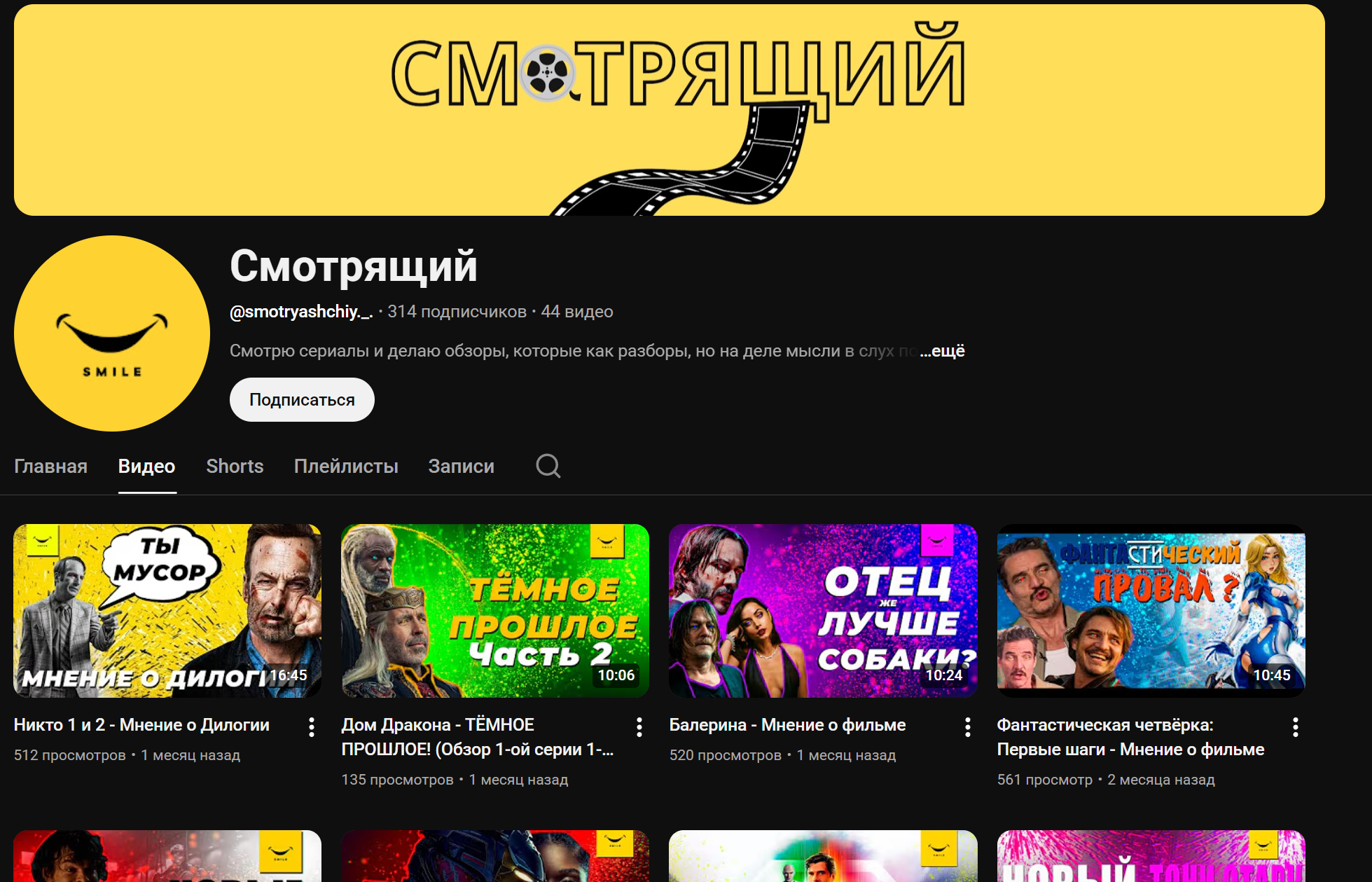 Я кстати завёл YouTube канал, где обсуждаю и разбираю кино, сериалы и т.д., если интересно: https://www.youtube.com/@smotryashchiy._./videos