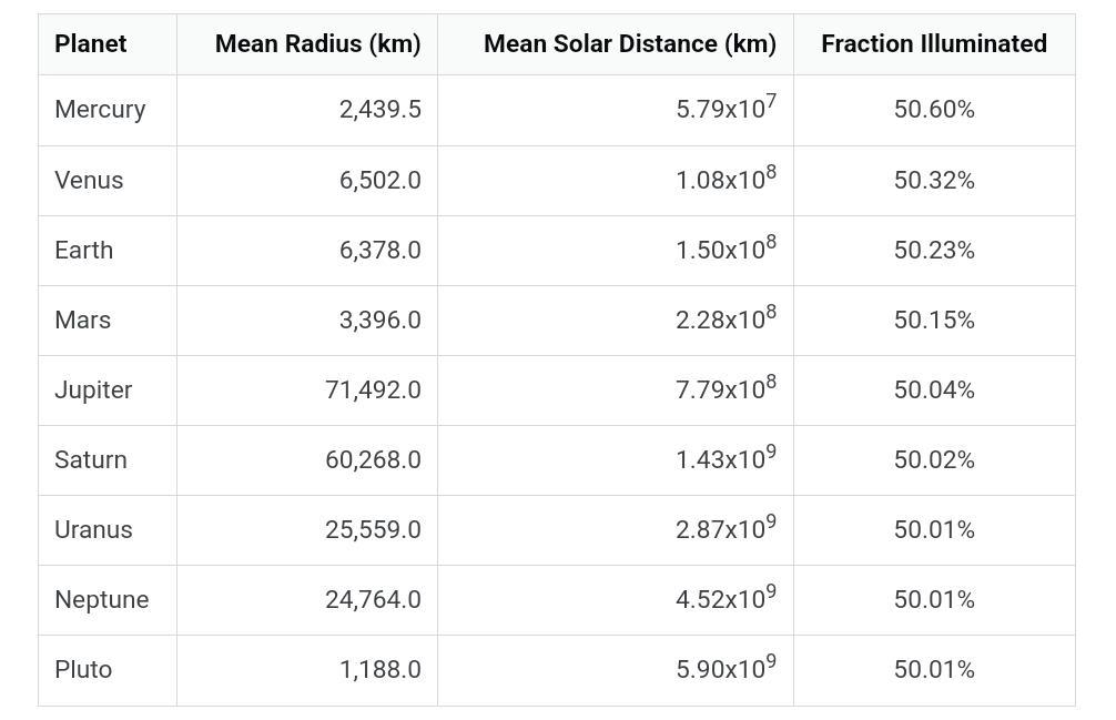 Я предоставил таблицу с прцентом освещенной поверхности для каждой планеты солнечной системы. Вменяемому человеку очевидно, что день и ночь на планетах сотносятся так же. На этом всё. Надеюсь процент от 24-х часов для земли, великий тригонометрист вычислить сможет без моей помощи.
