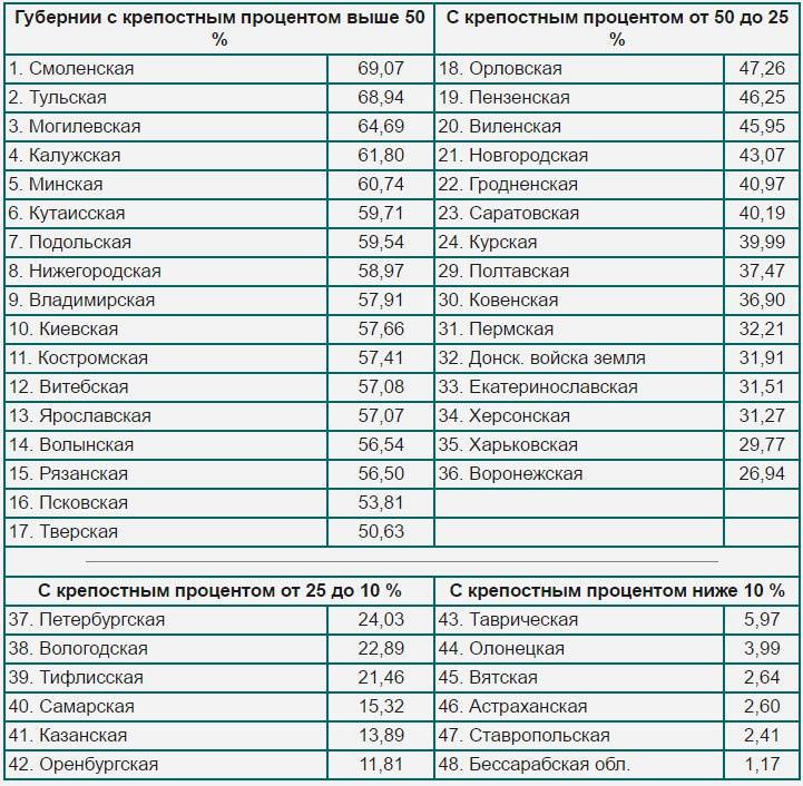 Автор, проверяйте, пожалуйста, информацию. В северных губерниях РИ не было крепостного права. (Архангельская, Олонецкая, Вятская, Тобольская). Местами помещичьи имения с крепостными могли быть, но процент таких землевладений был ничтожен. А то, так можно и крепостное право к востоку от Урала отменить. Вот местные бы удивились