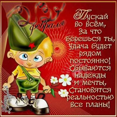 Друзья, поздравляю вас с 23 февраля! Это действительно важный праздник в нашей стране! Очень хочется пожелать в этот день, чтобы вы всегда оберегали людей, которые верно идут с вами по жизни! Мирного неба, побольше солнечных дней и прекрасного настроения! Пусть все задуманное обязательно получится! Огромного счастья, успехов во всех начинаниях, любви и благополучия!