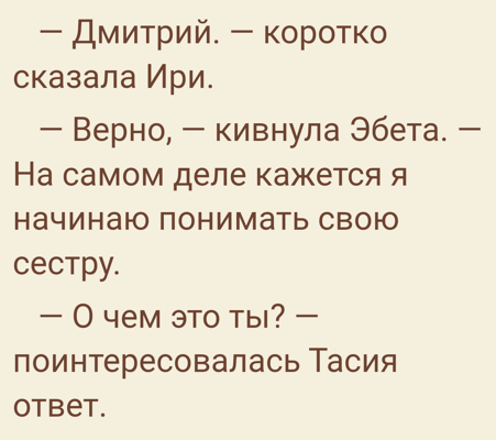 Предыдущий комментарий я писал на 20-каком-то часу бодрствования, главу читал немногим раньше(пытался расслабиться за книжками, после напряжённой деятельности), если соображать я тогда ещё мог, то память выжимала из себя что-нибудь со скрипом, от чего и появляются подобные жалобы/мольбы.