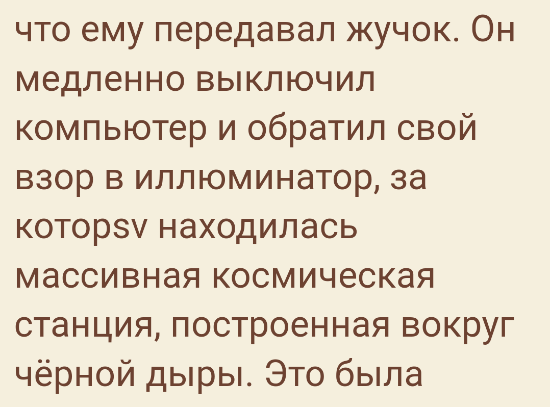 Вкусно, интересно, но мне не хватает обозначения "перехода контроля", приходится переключаться на рукопись чтобы понять от лица кого был фрагмент.