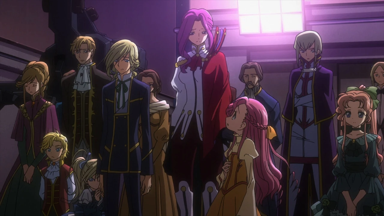 Вот честно я тоже не смог понять, кто это рядом с ними и Шнайзелем стоит. Кроме как на этом кадре данные дама и мальчуган совершенно нигде не фигурируют, объявленный императором Нео-Британии в 2025 a.t.b. Каллис аль Британния чуть ли не в канун Черного Восстания родился (и был ли он вообще сыном Чарльза, а не безымянным несчастным с промытым Гиассом мозгами?)... Стоящие на заднем плане хотя бы похожи на безымянную массовку с вот этого снимка, Нонетт Эннеграм тоже достаточно узнаваема - хотя раз последняя присутствует на правах вассала одной из ветвей императорского дома, может и неизвестная парочка из числа придворных?