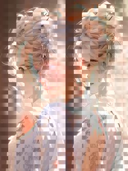 Ярко-жёлтые глаза, несколько проколов в ушах и в середине губы, тату на ключицах, груди и на две полностью руки, влажные, длинные, чёрные волосы прилипающие ко лбу, острые скулы, пухлые алые губы и этот такой неаккуратный шрам на глазу... Запоминающая внешность... Очень привлекательный...
