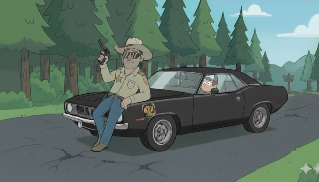 Молодой парень, служивший в полицейском департаменте Портленда, штат Орегон, за один крупный "косяк" был "сослан" в городок Гравити Фолз на пост шерифа. На дворе 1980 год, в загашнике - память прошлой жизни на посту сельского участкового в России десятых годов, знание канона и влиятельные родственники-аристократы. Впереди годы службы в самом мистическом городке западного побережья, наполненные попытками не сломать себе голову исключениями в законах этого городка от остального штата и страны, а так же не вывихнуть язык, пытаясь произнести вслух фамилию бессменного мэра городка. И честно говоря, фамилия мэра кажется куда более страшной угрозой, чем одноглазый демон жёлтой формы и треугольного цвета.