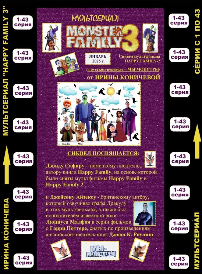Сиквел мультфильма Happy Family-2, в русском переводе – Мы Монстры. Продолжение приключений семейки, умеющей превращаться в монстров, по фандому Monster Family, в русском переводе МЫ-МОНСТРЫ, события после мультфильма МЫ-МОНСТРЫ 2…