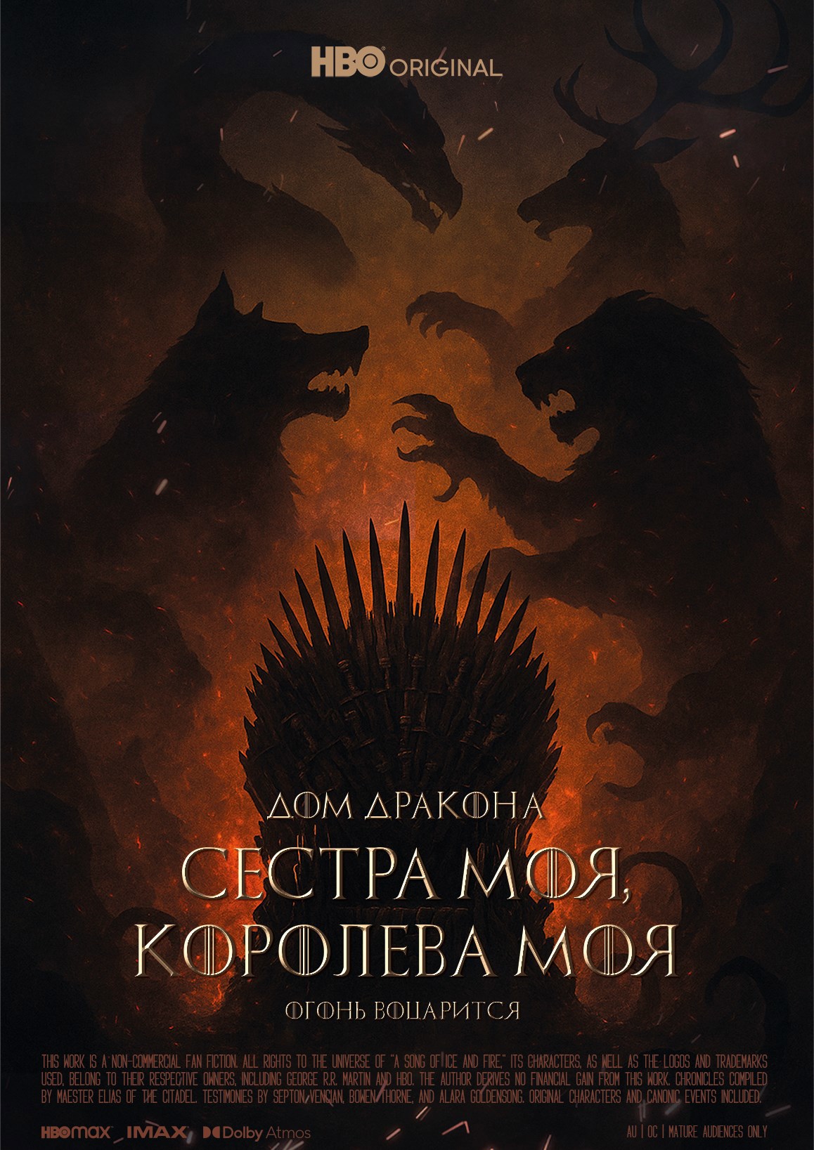 "Сны не сделали нас королями. Драконы — да." AU: У Визериса I две дочери. Ингелия слышит шепот Старых Богов о грядущей тьме. Эйнисса верит лишь в право драконьей крови, а ее наставником стал Деймон Таргариен. Когда двор раскололся, началась не просто война за трон, а битва двух вер, где самый опасный враг — внутри.
