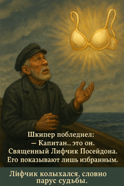 «Грудолов Атлантический» — история капитана Вити, который вышел в Атлантику не за рыбой, а за грудью. Его снасти — бананы в бюстгальтерах, его союзники — Ассоциация грудоловов, а враги — сирены-декольте. На закате ему является Священный Лифчик Посейдона, и охота превращается в миф, где грудь — это не улов, а вечный мираж.