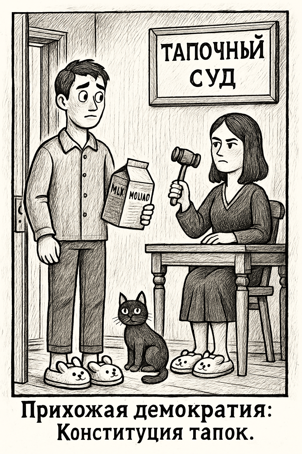 Я написал эту историю как сатирическую притчу о свободе и порядке, где Конституцию утверждают не политики, а тапки, а кот всегда остаётся в оппозиции.