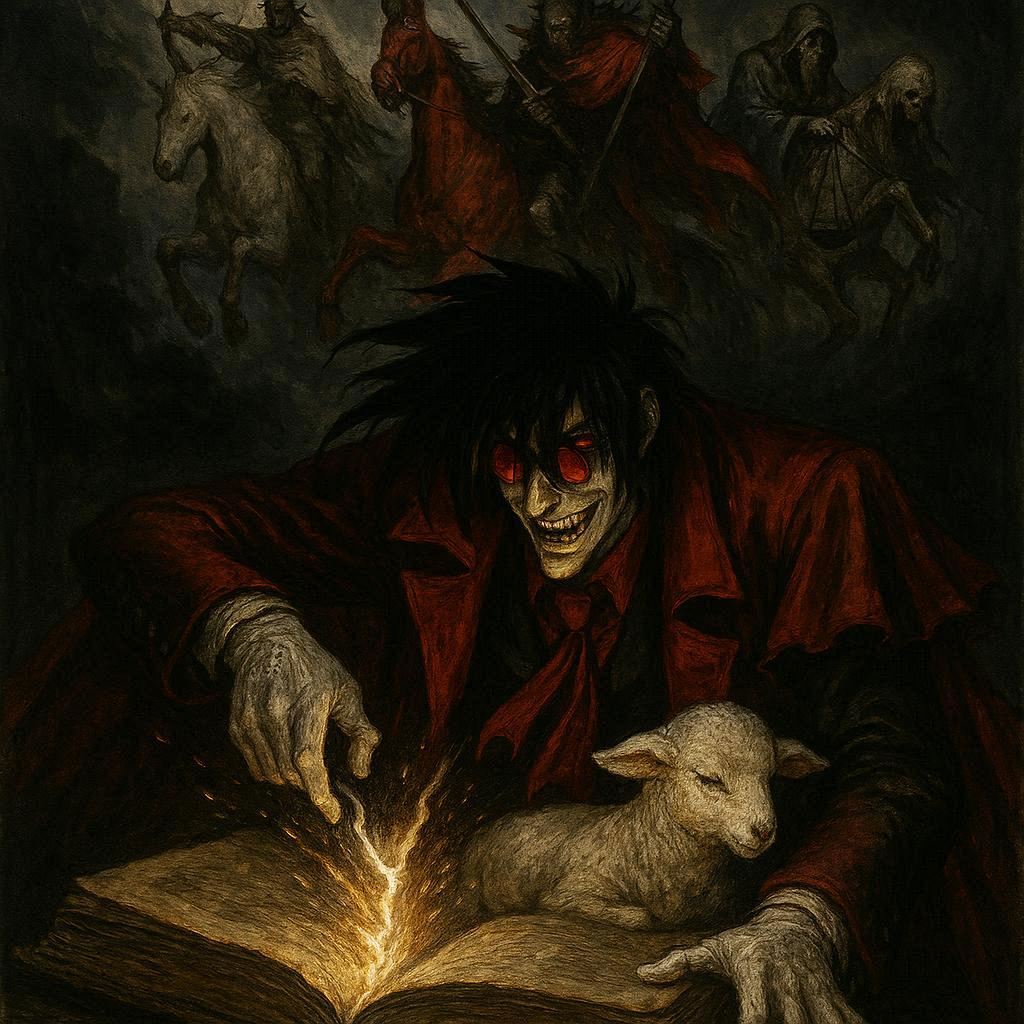 Апокалиптические образы Книги Откровения Иоанна Богослова, будучи архетипическими, находят неожиданные и мощные резонансы в современной культуре. Одной из самых ярких таких параллелей является сцена снятия семи печатей с Книги Жизни Агнцем (Христом) и мотив освобождения вампира Алукарда из-под многовековых печатей в аниме и манге «Hellsing» Хирано Коты. На поверхностный взгляд, это лишь заимствование религиозной символики для зрелищности. Однако при глубоком анализе выявляется фундаментальное сходство: в обоих случаях снятие печатей является не просто актом высвобождения силы, но *актом легитимации народного сопротивления и окончательного суда*, где сама «печать» становится символом не столько заключения, сколько грядущего освобождения.