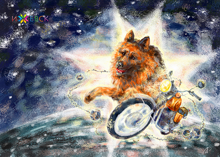 Обложка - открытка Анастасии Ажиминой для конкурса "Ижевск фантастический" (2017) по теме рассказа "Рыжий пес Иж".