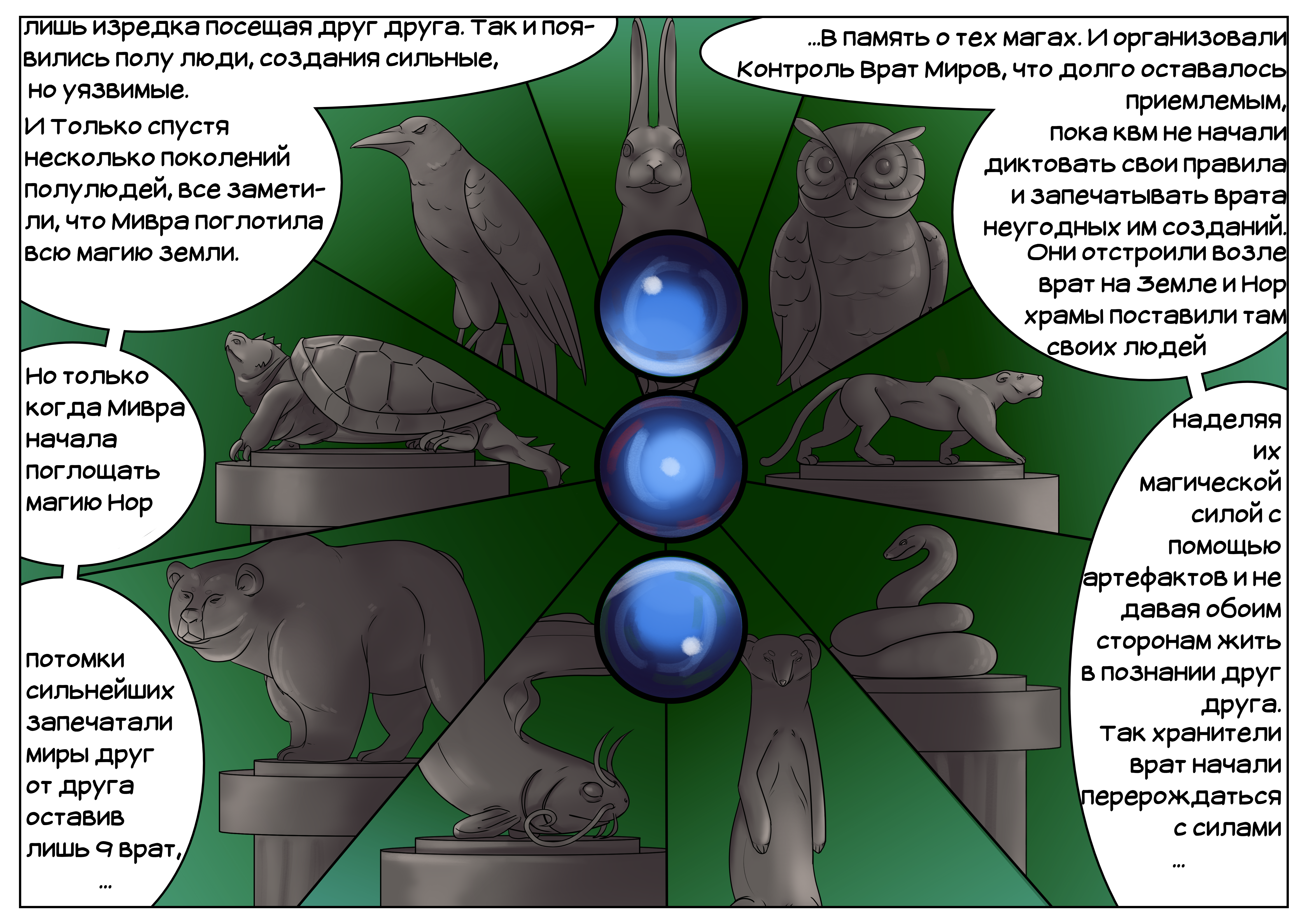 "Раньше была одна земля все создания жили в каком никаком мире. Но развитие людей сильно затормозилось, они не могли использовать магию и полагались только на материальное. Остальные же существа, от дюймовочек до драконов, были сведущи в разных магиях и учениях, решили отделится от людей и жить подальше, дабы защитить их от себя."