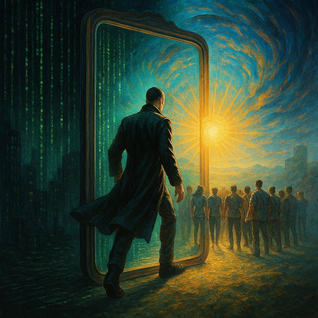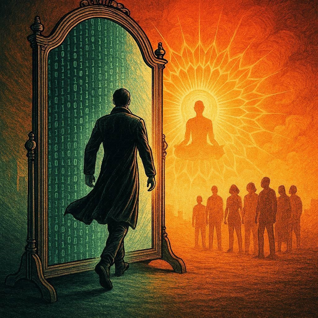 В культовом фильме «Матрица» братьев Вачовски момент погружения Нео в зеркальную поверхность становится ключевым символом трансформации сознания. Это не просто спецэффект, а мощная метафора перехода от иллюзорного восприятия мира к постижению его подлинной сути. Зеркало здесь — граница между двумя реальностями: миром симуляции («матрицы») и миром подлинного бытия. Этот акт можно рассматривать через призму буддийской концепции нирваны — прекращения страданий через разрушение неведения. Однако «Матрица» предлагает не классическую модель ухода от мира, а динамичный миф о пробуждении, ведущем к действию и общине.