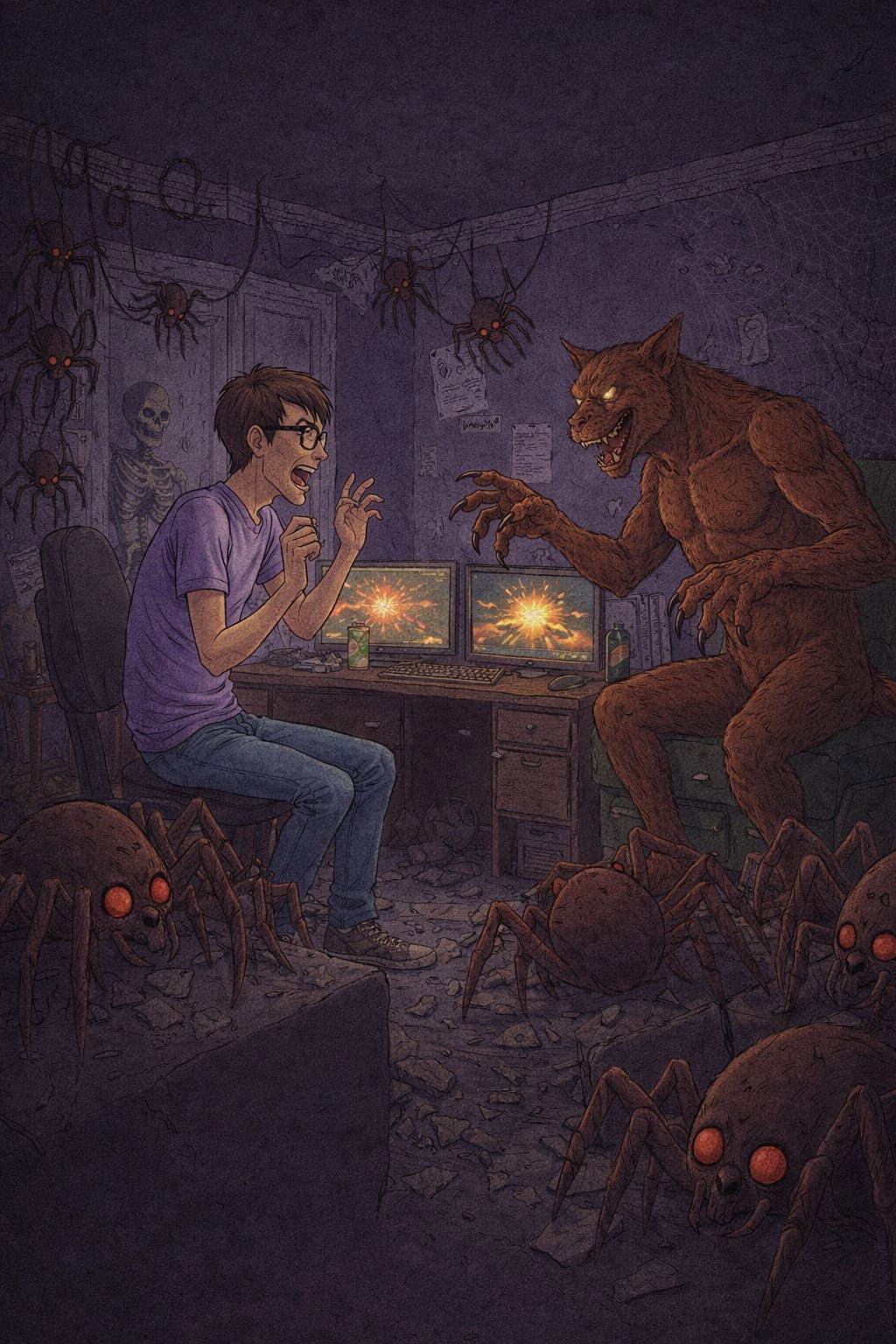 Программист Валентин не верил в мистику, пока мистика не пришла к нему домой сама. Осажденный гигантскими пауками и таинственным монстром-гурманом, он обнаруживает, что обычная сталь и верная клавиатура могут быть бессильны против ожившего ночного кошмара. Это история о том, как один «праздник» может навсегда изменить человека, превратив тихого кодера в одержимого Мстителя.