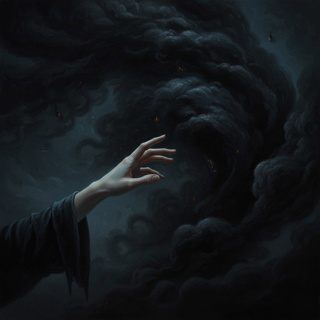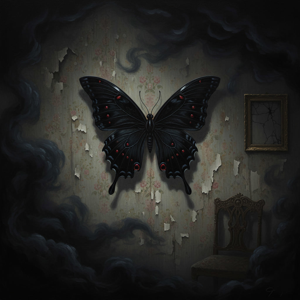 Бабочка, крылья темнее ночи, а сама тьма, как дымка, витает у них,