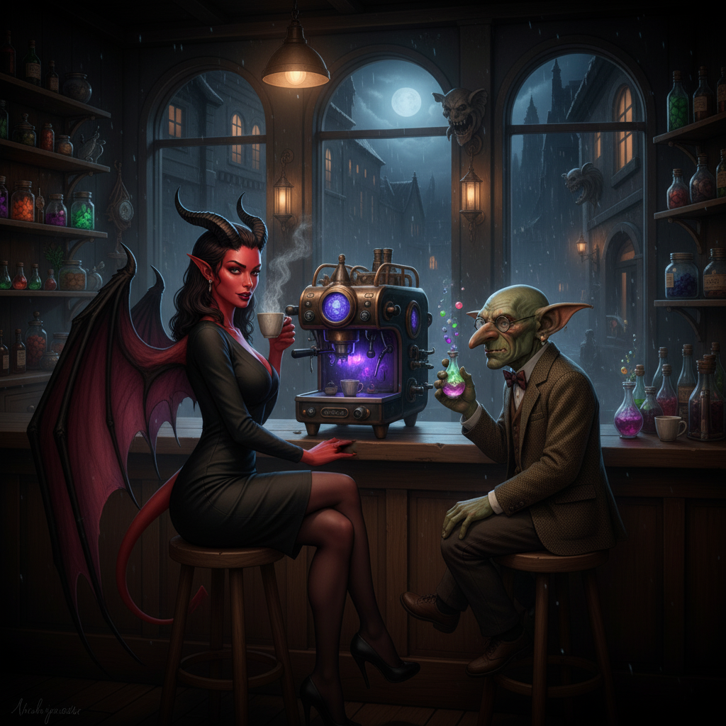 В этой кофейне собирается весь свет темных сил. А все потому, что во-первых она располагается рядом с Бизнес Центром Коварного Альянса Радикальной Агрессии (сокращенно БЦ К.А.Р.А.), а во-вторых начинает свою работу с полуночи и до утра.