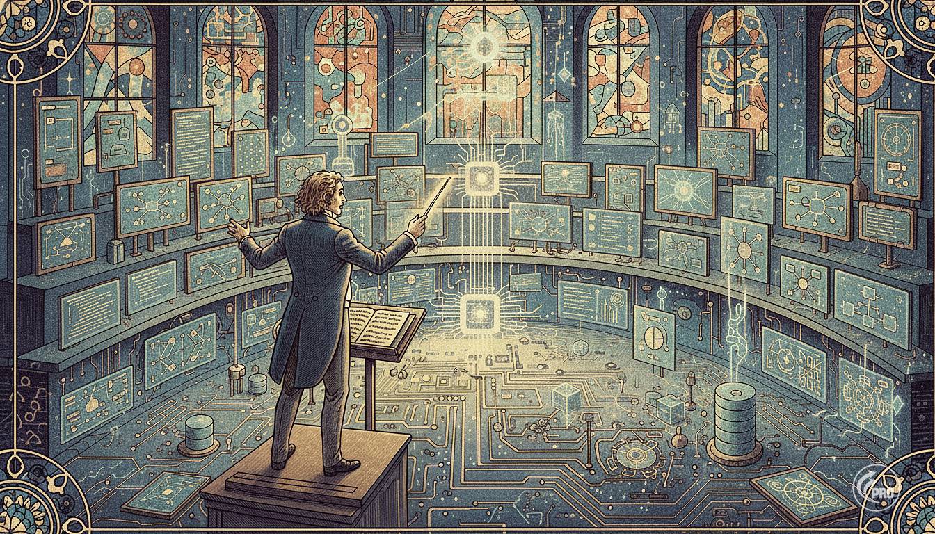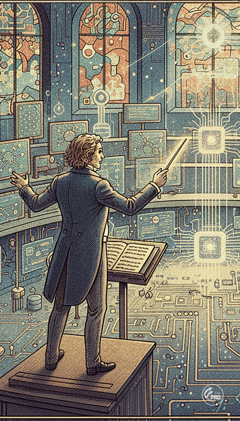 В просторном зале с высокими сводами расположились участники необычного оркестра. Перед пультом управления замер новый дирижёр, глаза которого изучали удивительное собрание исполнителей. Здесь были и классические скрипки-аналитики, выводящие строгие математические формулы, и мощные трубачи-процессоры, обрабатывающие потоки данных, и хор тонких голосов нейросетей, способных имитировать любые эмоции...