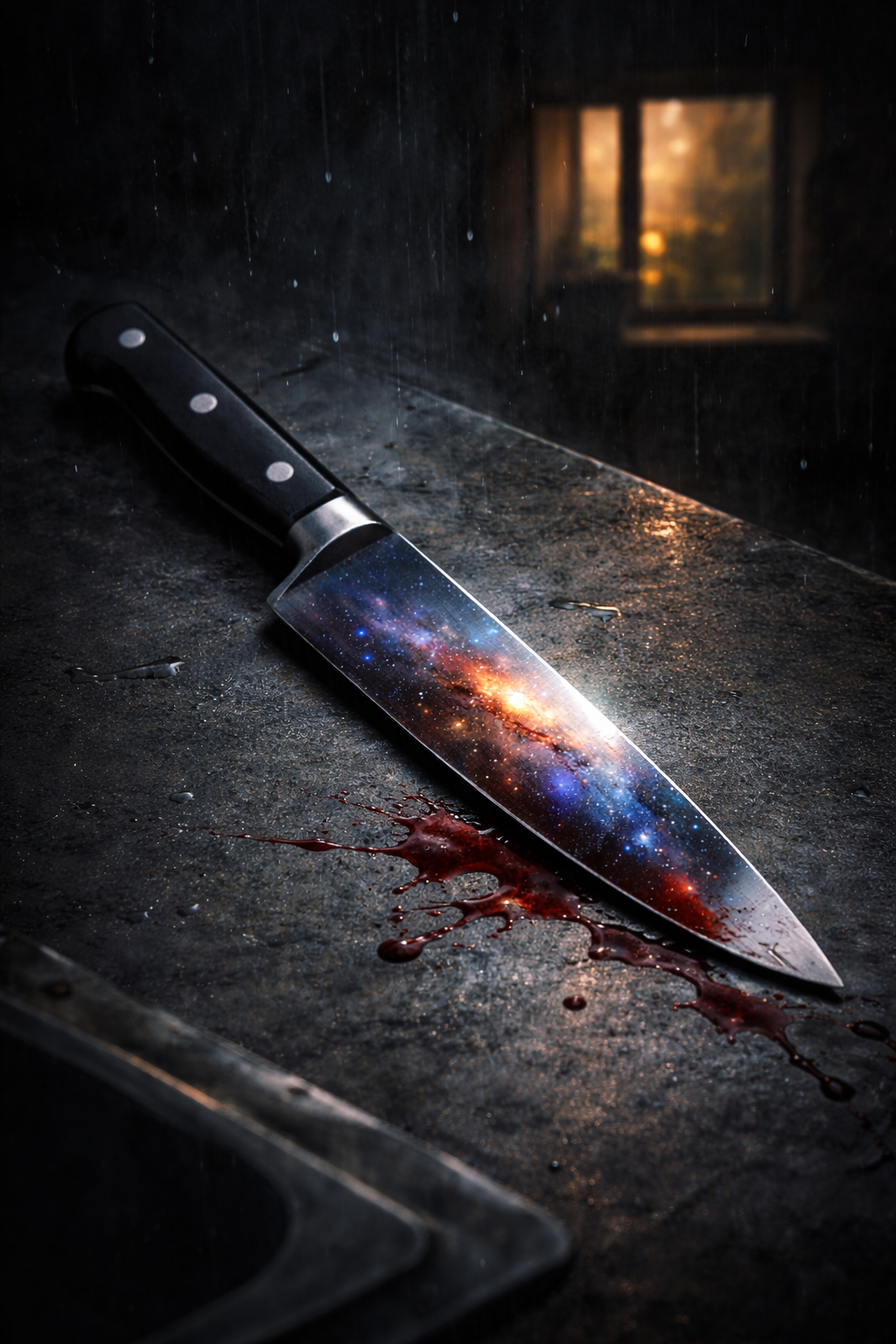 Нож — философская хроника материи, прошедшей путь от сердца сверхновой до руки девушки в астраханской квартире. От космического рождения атомов железа через миллиарды лет геохимии, шахт и заводов до кухонного ящика и одного резкого движения. Эпиграф стихотворения «Душа – нож» задаёт эмоциональный контраст холодной прозе, где нет морали — только цепочка причин, ведущая к акту самообороны.