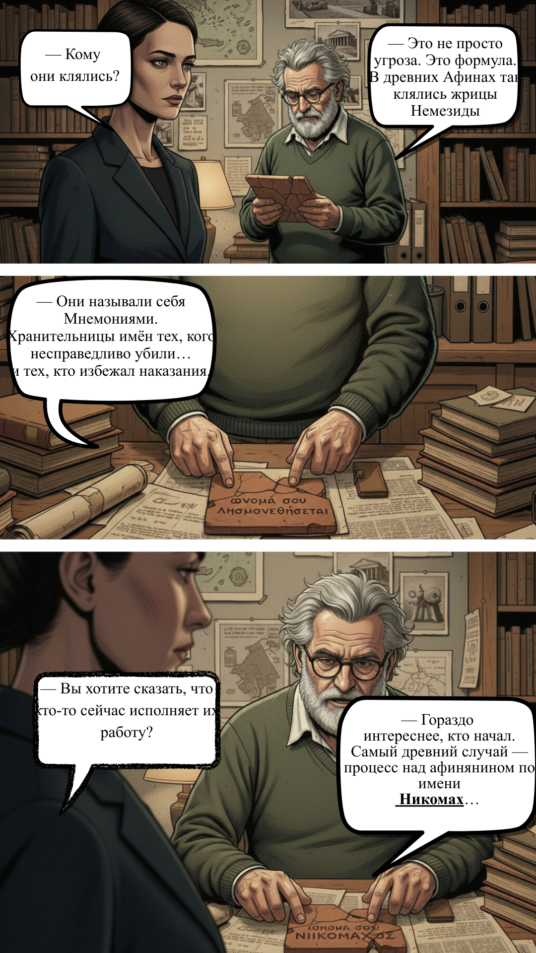В современных Афинах прокурор Эвридика Параскевопулу расследует убийство богатого коллекционера. Рядом с телом — древний артефакт с загадочной надписью. Профессор Теодорос Алексакис раскрывает ей тайну: убийца действует по древнему списку мести, вычёркивая имена потомков предателей.