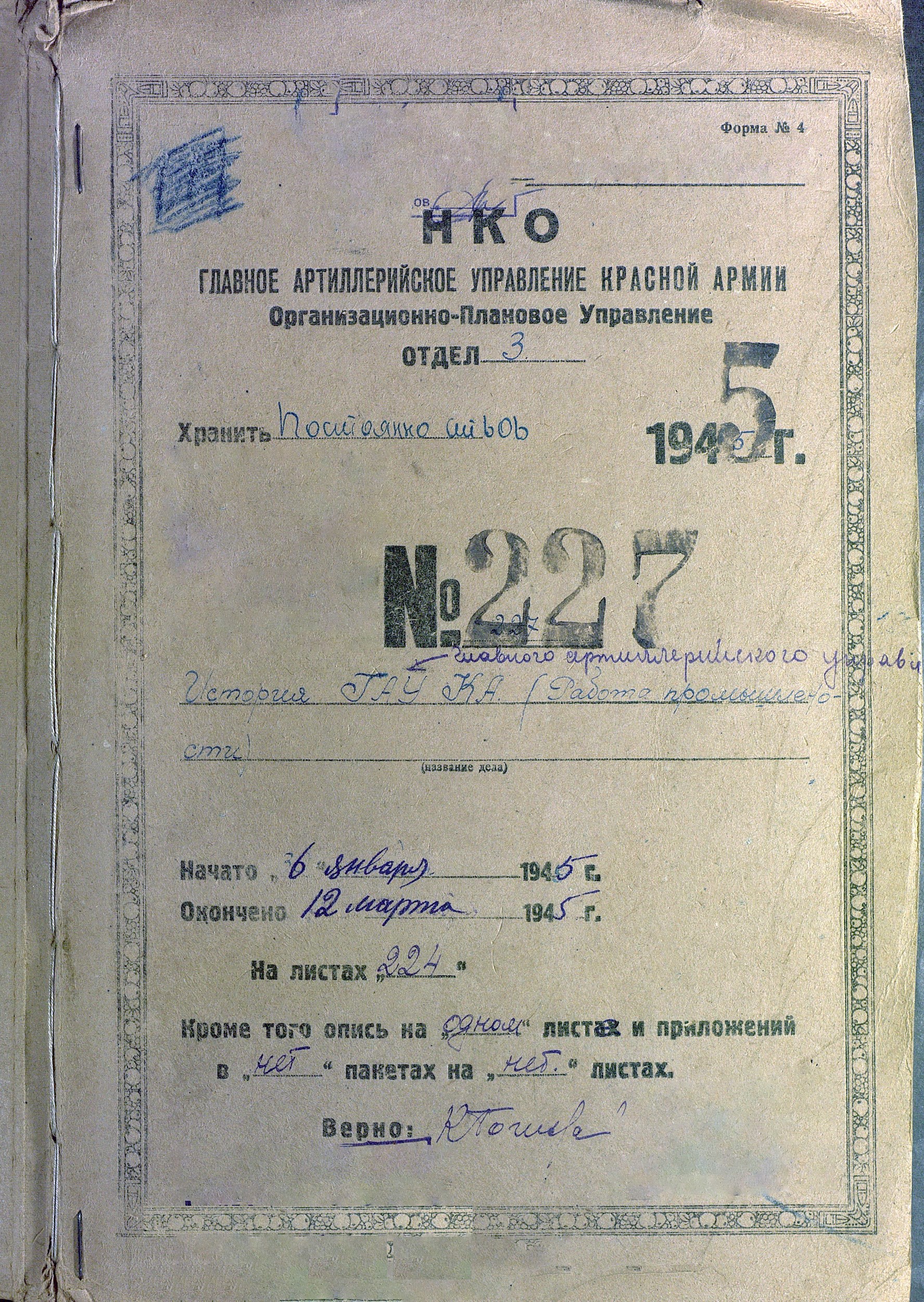Труд офицеров Главного Артиллерийского Управления Красной Армии, подготовлен в начале 1945 года и охватывает предвоенный период с 1938 по начало 1941 года. Работа посвящена промышленности СССР, выполняющей задачи по поставке для Красной Армии стрелкового и артиллерийского вооружения, боеприпасов, военных приборов. Труд раскрывает проблемы предвоенного планирования и выпуска продукции, заказываемой по линии ГАУ, сложности в производстве, пути их решения, количественное состояние вооружения и боеприпасов к началу Великой Отечественной