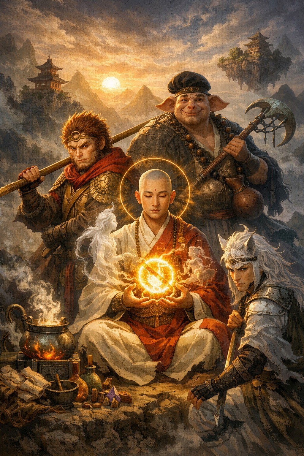 Классический китайский роман У Чэнъэня «Путешествие на Запад» (XVI в.) на первый взгляд предстает эпической фантасмагорией: история монаха Сюаньцзана, отправляющегося в Индию за священными сутрами в сопровождении трех необычных учеников — царя обезьян Сунь Укуна, получеловека-полусвиньи Чжу Бацзе и песчаного демона Ша Сэна. Однако под слоем приключений, битв с демонами и тонкого юмора скрывается глубокий духовный трактат, синтезирующий буддийские, даосские и конфуцианские учения. В буддийско-даосской аллегорической традиции само путешествие символизирует путь к Просветлению, где внешние спутники монаха суть проекции его внутренних качеств, а демоны на пути — олицетворение его собственных страстей и заблуждений.