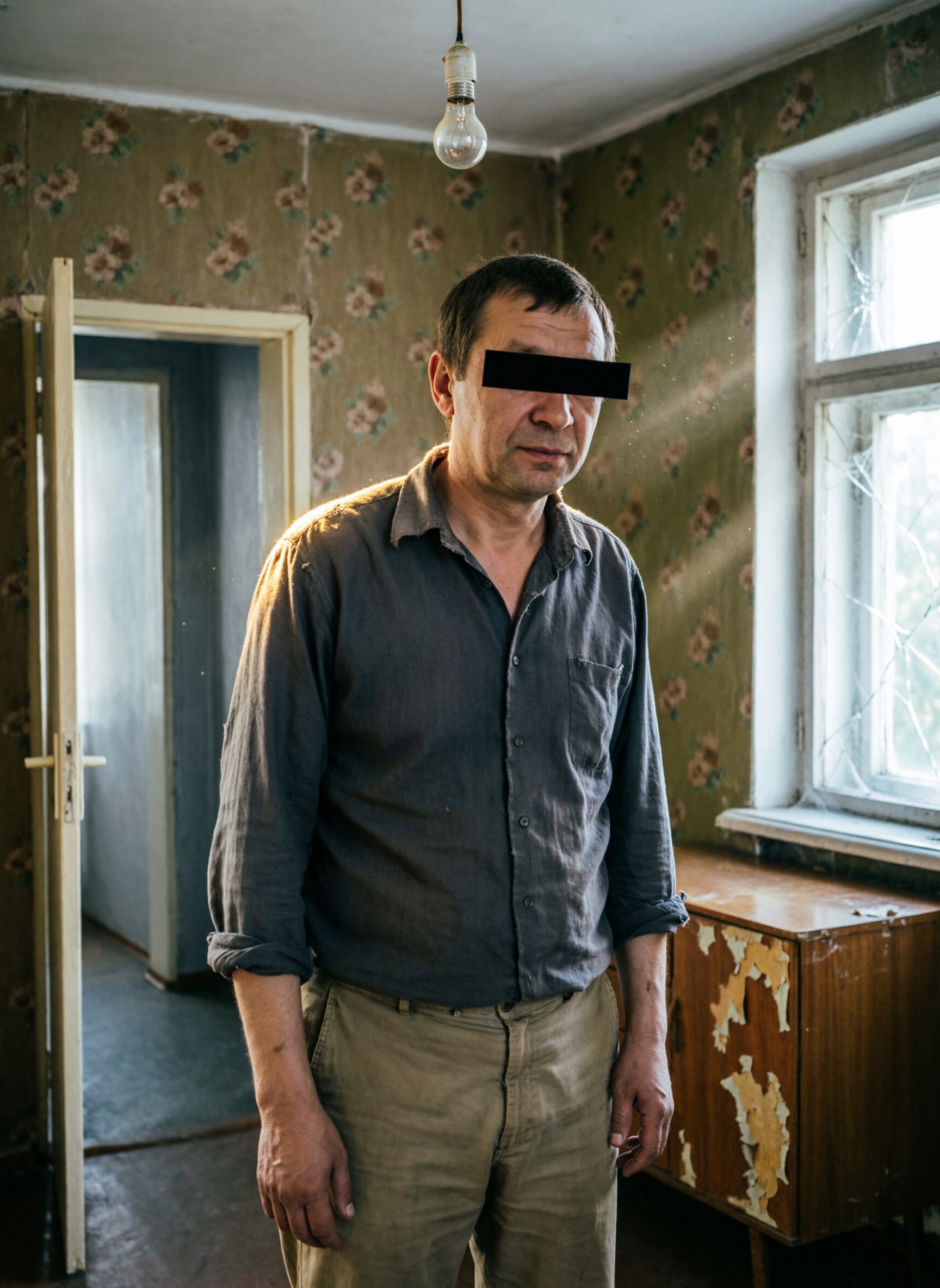 Это не портрет конкретного человека. Это портрет поколения, чья жизнь была перечеркнута долгом, начавшимся с расписки в 1998 году. Чёрная полоса вместо глаз — не маскировка. Это знак того, что таких судеб — миллионы