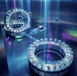 Выращивание тел происходит на специальных биофермах, где в капсулах с питательным раствором зреют обнажённые человеческие фигуры — без сознания, с подключёнными к спинному мозгу нейроинтерфейсами. За процессом следят операторы.